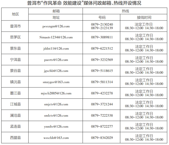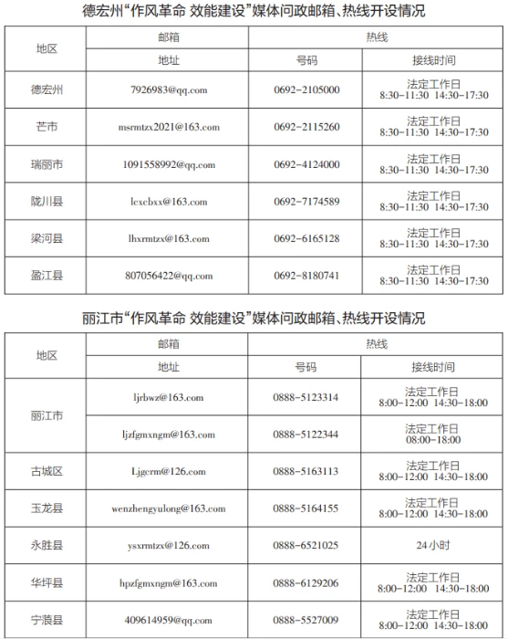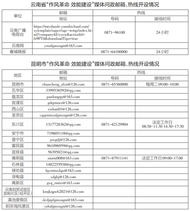 為深入貫徹落實《云南省推進作風革命加強機關效能建設的若干規(guī)定(試行)》,即日起,我省將全面開展“作風革命 效能建設”媒體問政工作。全省各級媒體將面向社會公眾開設“作風革命 效能建設”問政專區(qū),采用電子郵箱、廣播電視專題節(jié)目、熱線電話等多種形式暢通群眾、基層、企業(yè)訴求渠道,廣泛收集各類意見建議,開展輿論監(jiān)督。歡迎廣大群眾、各類企業(yè)就全省各地區(qū)各部門在轉(zhuǎn)變作風、提升效能,服務群眾、服務基層、服務企業(yè)過程中存在的不良現(xiàn)象、典型問題,積極提供相關新聞報道線索。各級媒體將及時把意見建議和問題線索反饋至有關部門,持續(xù)跟蹤問效,推進問題解決。