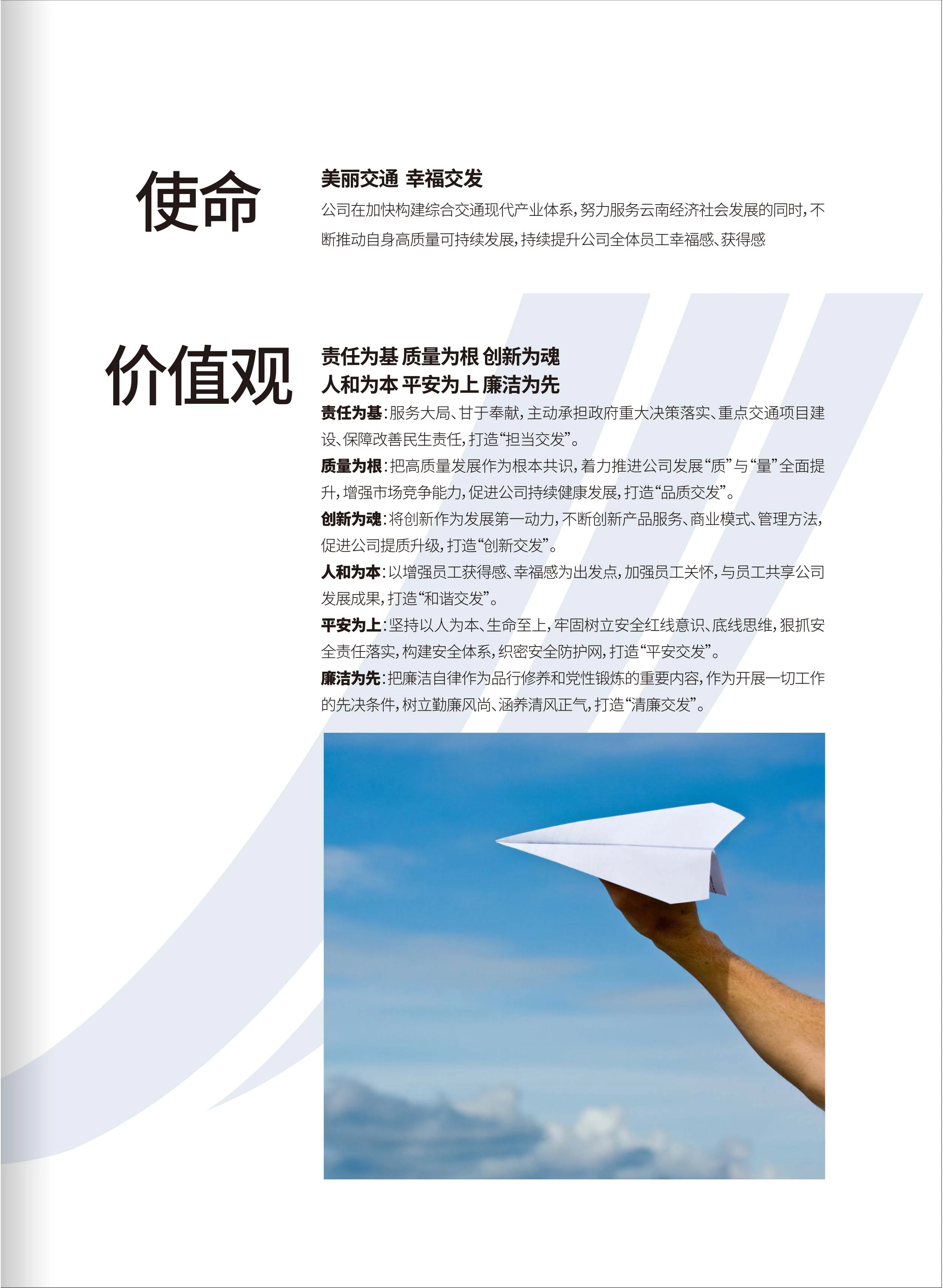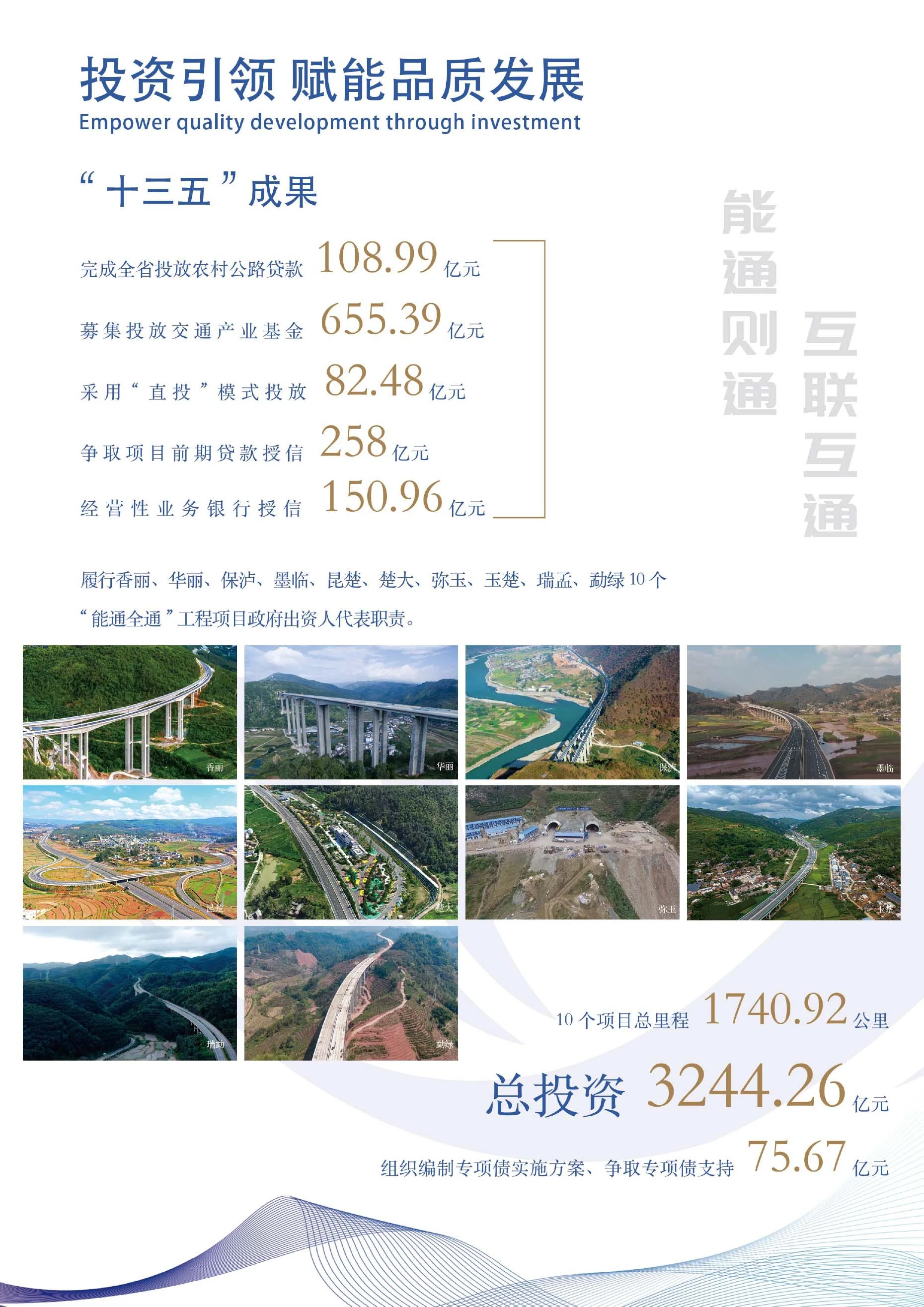 以“規(guī)模提升、集采集供、品類拓展”為發(fā)展思路,依托交通主業(yè)擴大物資貿易業(yè)務規(guī)模;以“價值挖潛、品牌提升、延伸拓展”為發(fā)展核心,深挖路域資源全面提升運營管理水平;以“開放合作、創(chuàng)新發(fā)展、精品打造”為發(fā)展目標,聚焦優(yōu)勢資源持續(xù)深化對外合作;堅持“高起點、高質量、高水平”發(fā)展要求,創(chuàng)新“交通產業(yè)+資源整合+資本嫁接”商業(yè)模式,著力構建成為一體多元企業(yè)%,有多個項目獲獎。其中,昆玉高速公路獲2003年“中國建筑工程魯班獎”;硯平高速公路獲2006年度“國家優(yōu)質工程銀質獎”;安楚高速公路獲2007年度“國家優(yōu)質工程銀質獎”獎項。