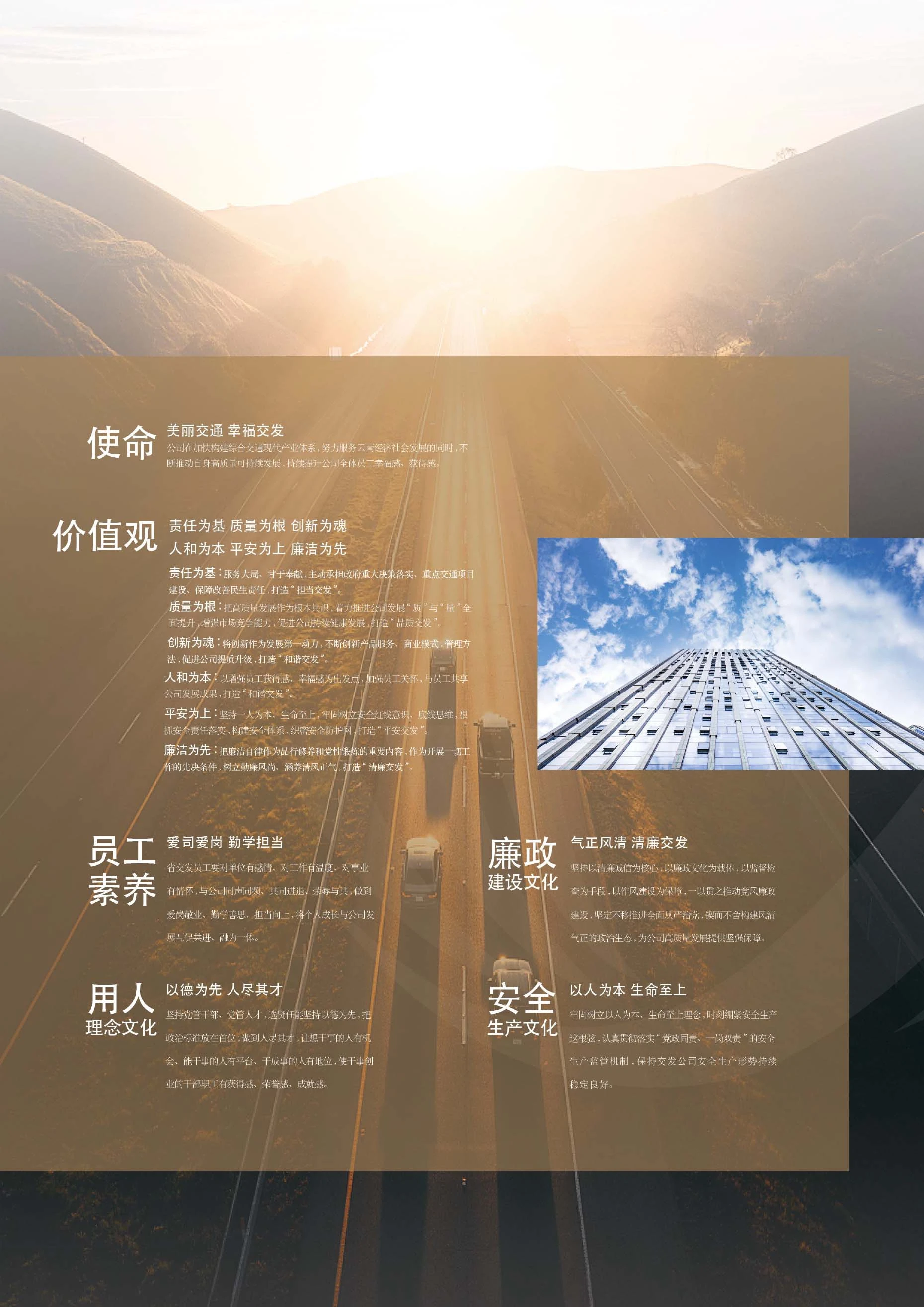 公司成立以來,緊緊圍繞省交發(fā)公司“1345”發(fā)展戰(zhàn)略及“1+N”經營布局,秉承“持續(xù)創(chuàng)新、穩(wěn)健經營、綠色發(fā)展、開放合作、共創(chuàng)共享”發(fā)展理念,弘揚“厚德篤行、至美致遠”人文精神,堅定不移走市場化發(fā)展道路,矢志不渝做大規(guī)模、做優(yōu)產業(yè)、做強企業(yè)