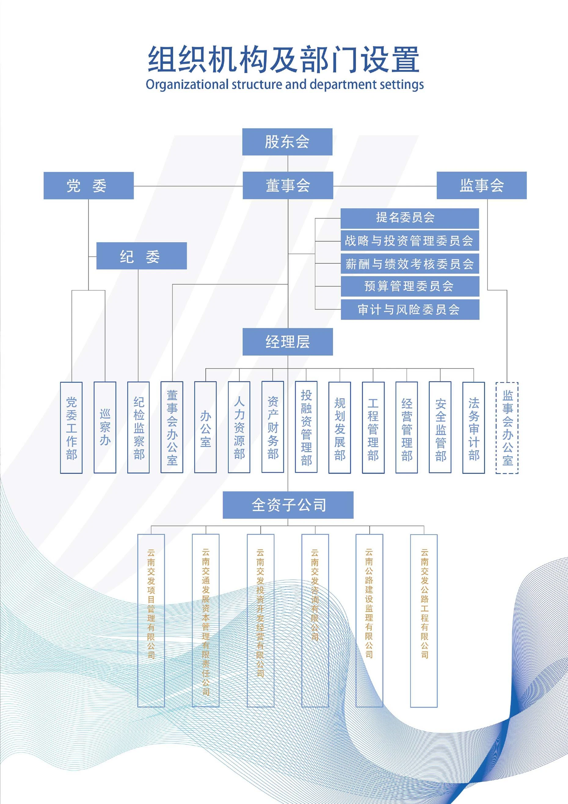 云南交發(fā)投資開發(fā)經營有限公司于2018年1月30日成立,注冊資本金10億元,為云南省交通發(fā)展投資有限責任公司全資子公司,公司內設6個部門,下設全資、控股、合資企業(yè)5個。